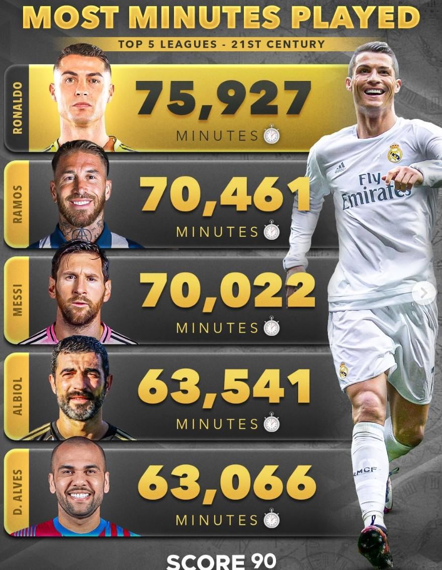 据Score90的数据统计,在21世纪欧洲五大联赛中,C罗出场时间75927分钟居首,拉莫斯70461分钟排名第二,梅西70022分钟排名第三。