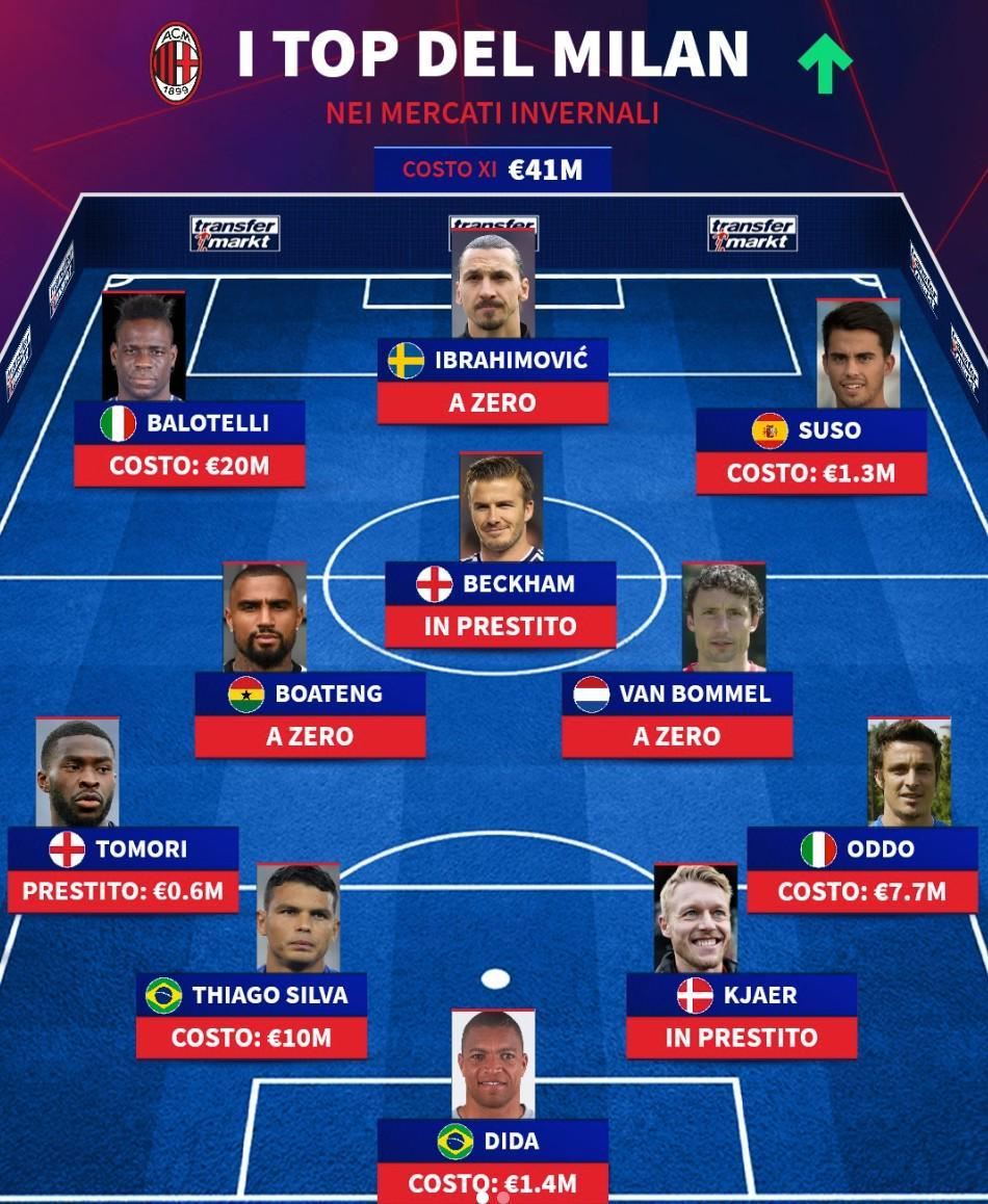 北京时间1月18日,德转评选了AC米兰队史冬窗引援的最成功11人阵容,伊布拉希莫维奇、巴洛特利、贝克汉姆以及蒂亚戈-席尔瓦上榜。