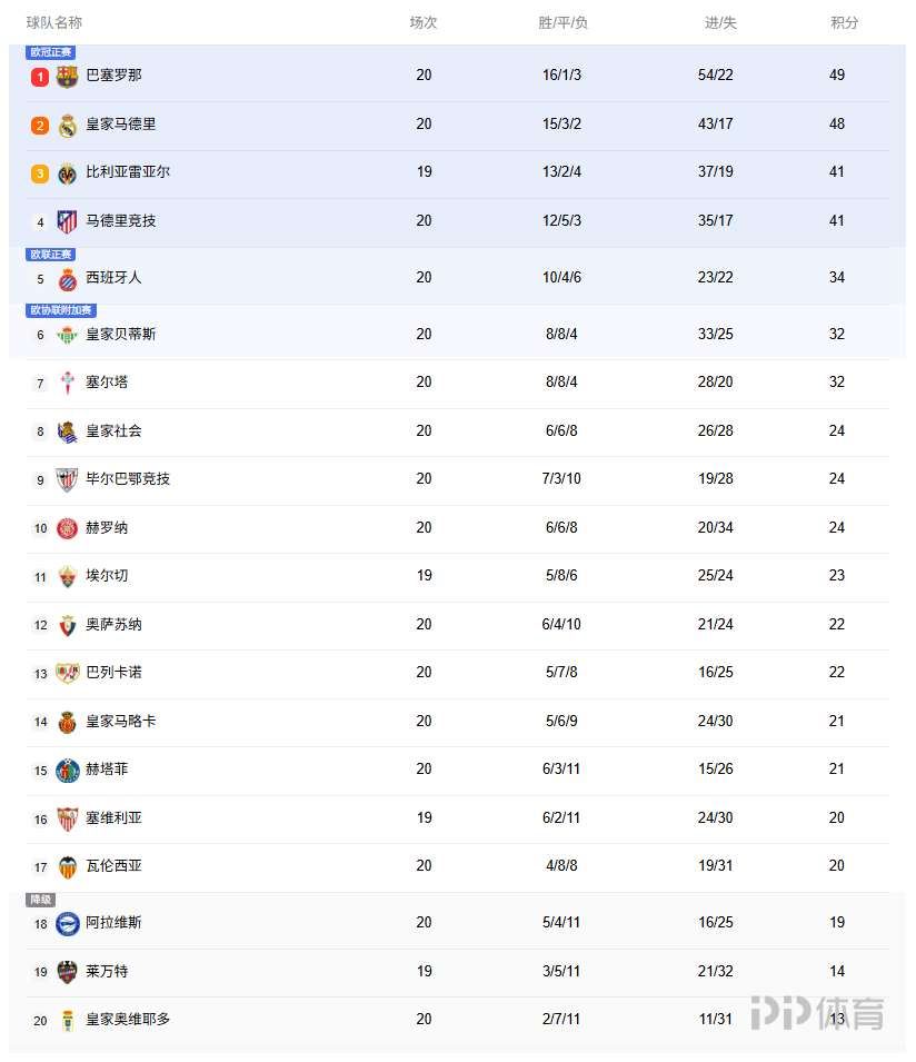西甲积分榜:巴萨9连胜止步,领先第二皇马1分