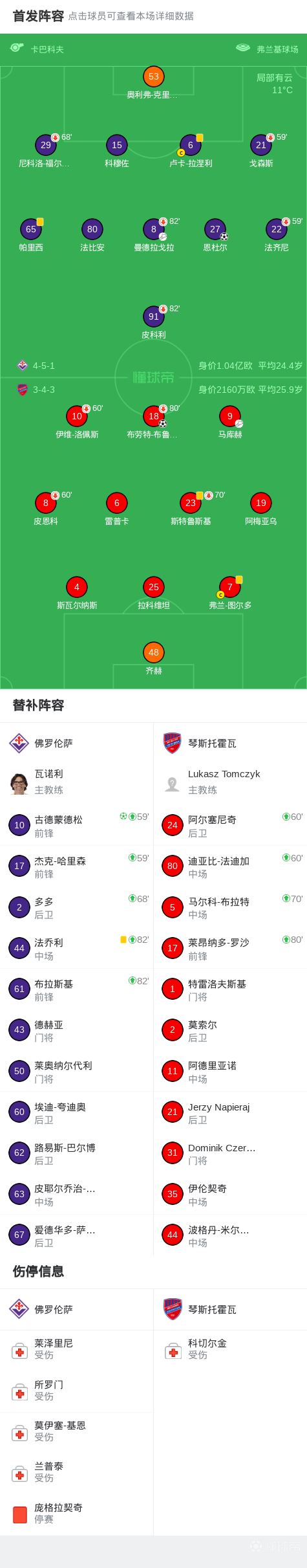 北京时间3月13日欧洲协会联赛 1/8决赛首回合,佛罗伦萨对阵琴斯托霍瓦。下半场布鲁内斯首开记录,两分钟后恩杜尔世界波扳平比分,补时阶段阿梅亚乌手球送点,古德蒙德松点射绝杀。最终比分佛罗伦萨 2-1 琴斯托霍瓦。