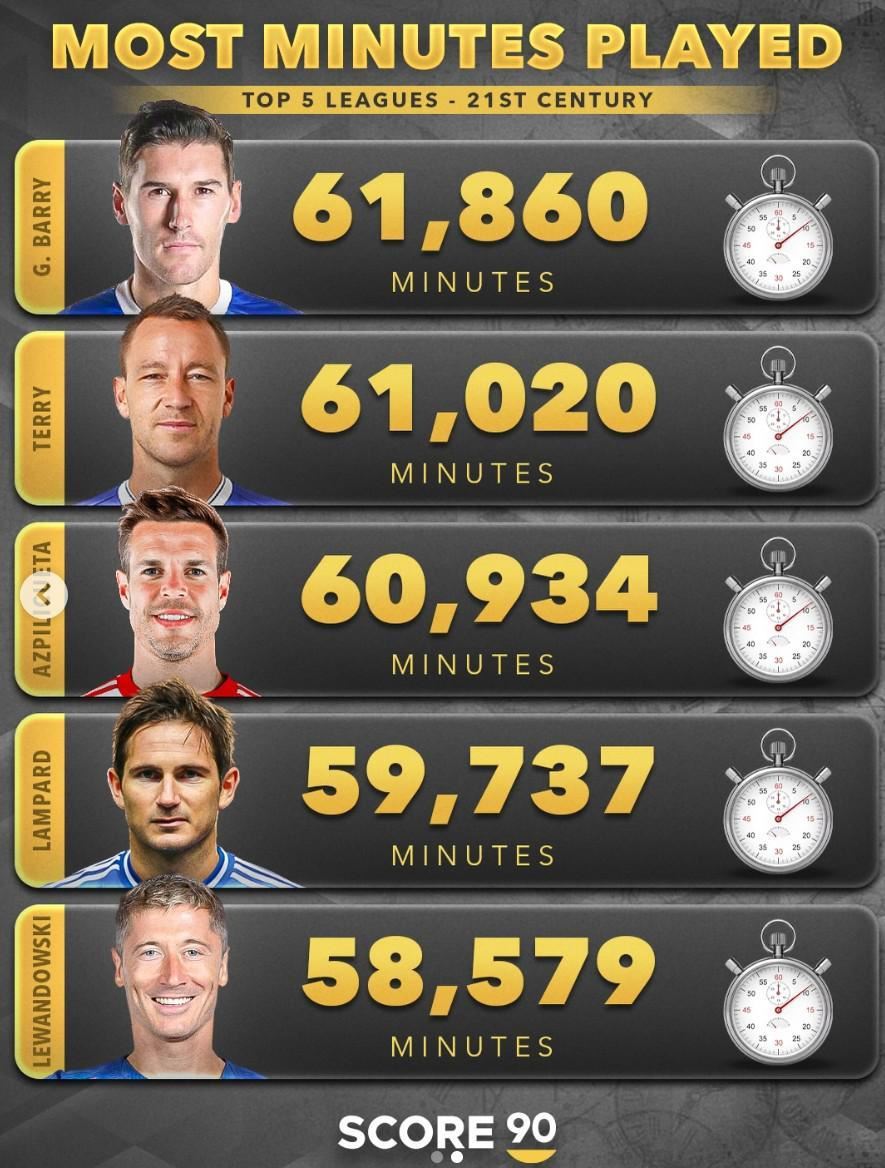 21世纪欧洲五大联赛出场时间前十榜单